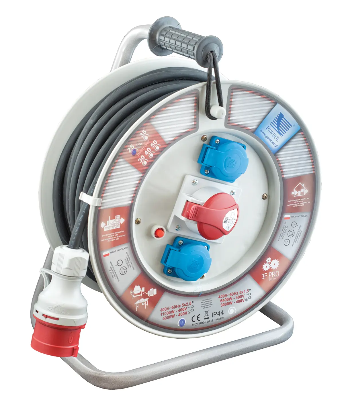 Predlžovače na bubnoch, IP44. 400V, Tepelná ochrana Konektory: 16A/5p - 400V 16A/5p 2xGZ16A Šírka bubna: 340mm Dlžka: 35 Typ káblu: H05RR-F5x2,5 Izolačný materiál: GUMA Max. výkon svinutý kábel: 5000W Max....