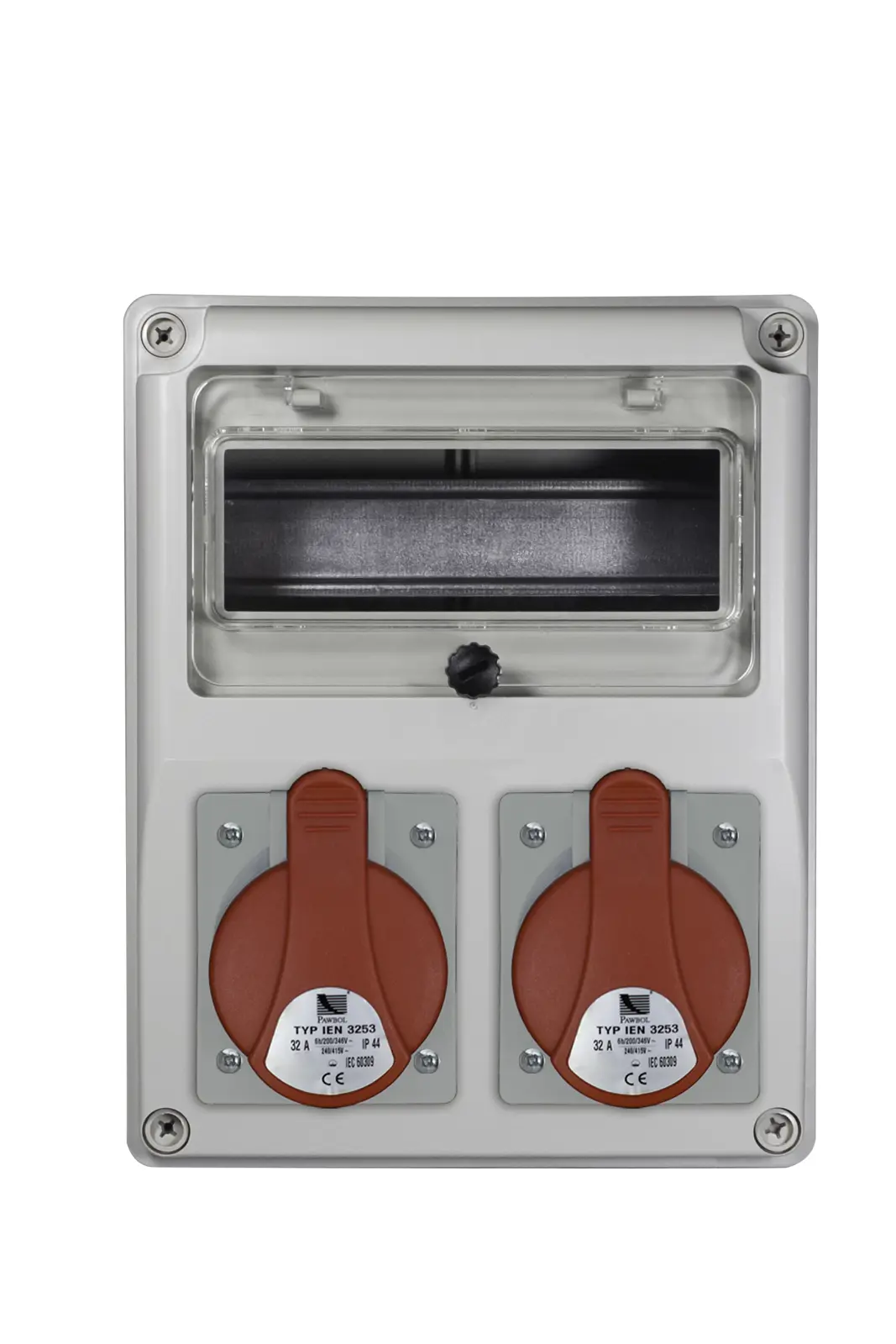 R-BOX 240-8 s rúčkou, PG16, ABS, IP44 8S inšpekčné okienko 1x32A/4p 1x16A/4p Rozmery: 200,5/252,5/103mm Balenie: 1ks
