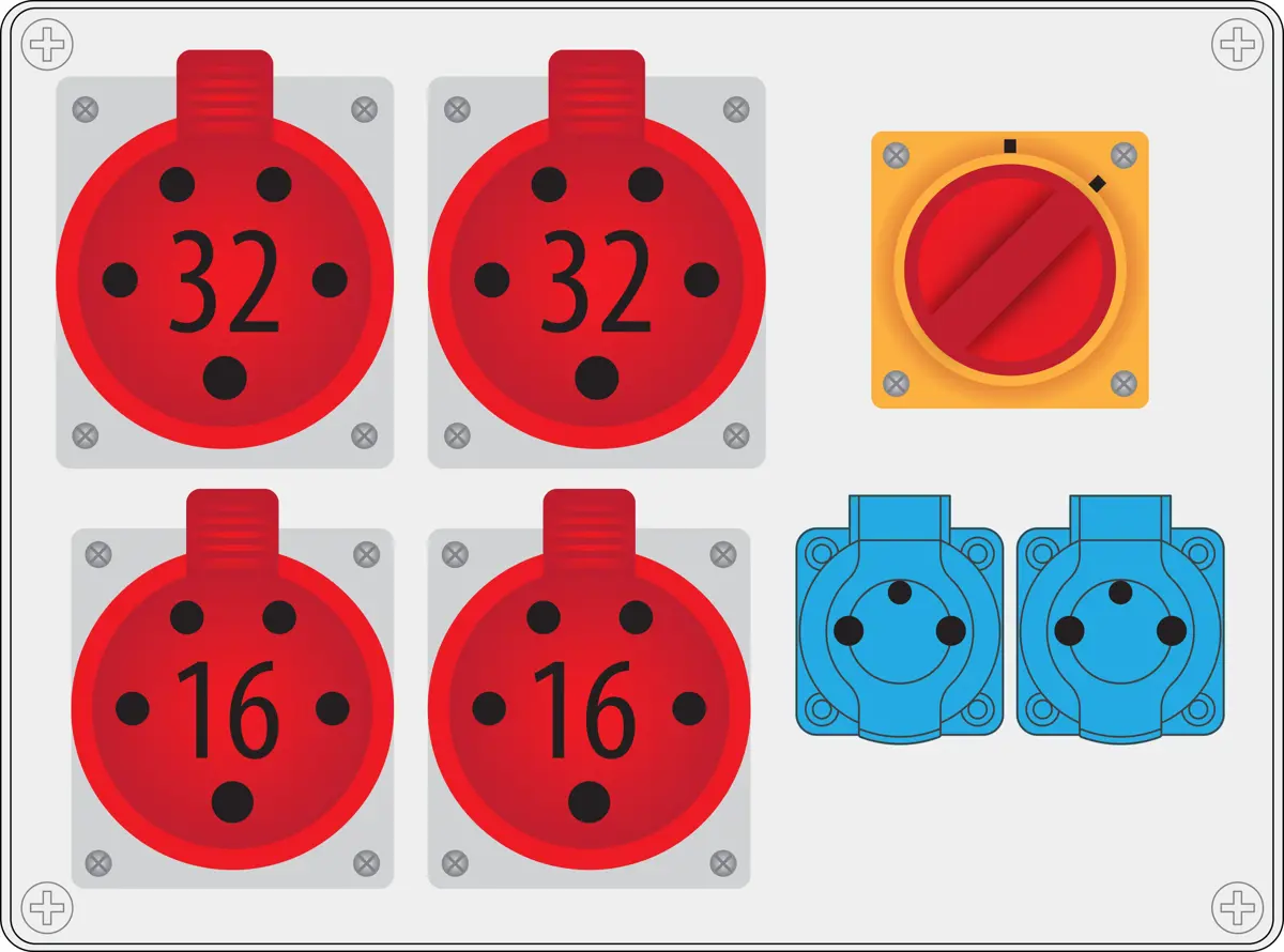 R-BOX 300, PG21, ABS, IP44 Rozmery: 310/230/120-200 Zásuvky: 2x250V 2x32A/5p 2x16A/5p Vypínač Balenie: 1ks