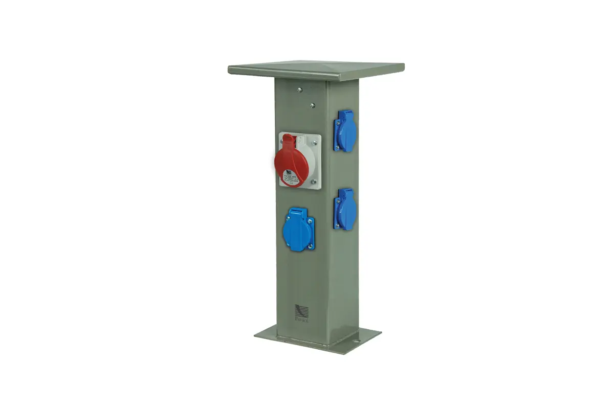 Stlpiková rozbočnica - veľká, RAL 7035, IP 44 Materiál: Oceľ Zásuvky: 1x 16A/5p 3xGZ16A Stlpec: 100/100/451mm Základňa: 170/120/3mm 2 Montážne otvory: 10,7mm Vrchol: 200/200/15mm Velková výška: 470mm