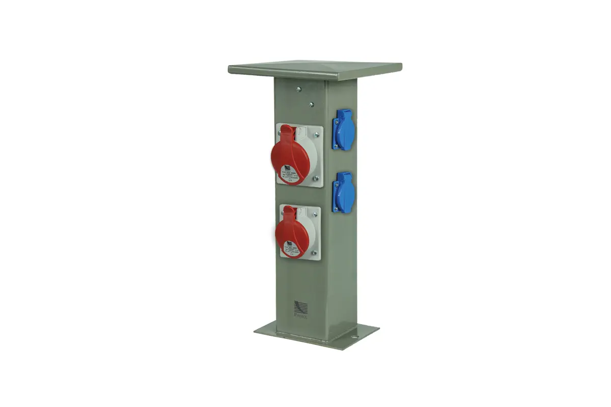 Stlpiková rozbočnica - veľká, RAL 7035, IP 44 Materiál: Oceľ Zásuvky: 1x16A/5p 1x32/5p 2xGZ16A Stlpec: 100/100/451mm Základňa: 170/120/3mm 2 Montážne otvory: 10,7mm Vrchol: 200/200/15mm Velková výška: 470mm