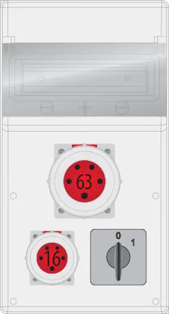 Zásuvková skriňa, PG21, IP65 Zásuvky: 1x63A/5p 1x16A/5p Vypínač Rozmery: 500/270/223mm Lišta TH35 súčasť balenia Farba dvierok: Transparentná Farba skrine: Šedá Ochrana pred mechanickými nárazmi: IK08...