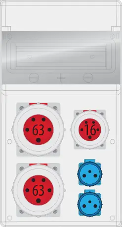 Zásuvková skriňa, PG21, IP65 Zásuvky: 2x250V/16A 2x63A/5p 1x16A/5p Rozmery: 500/270/223mm Lišta TH35 súčasť balenia Farba dvierok: Transparentná Farba skrine: Šedá Ochrana pred mechanickými nárazmi: IK08 Tepelná...