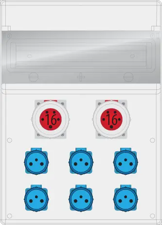 Zásuvková skriňa, PG21, IP65 Zásuvky: 6x250V/16A 2x16A/5p Rozmery: 500/362/223mm Lišta TH35 súčasť balenia Farba dvierok: Transparentná Farba skrine: Šedá Ochrana pred mechanickými nárazmi: IK08 Tepelná odolnosť: -25°C/+85°C Trieda izolácie II 18...