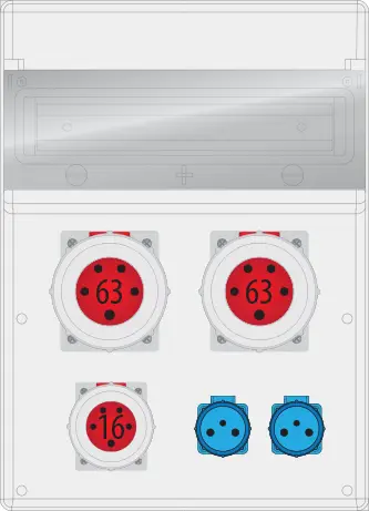 Zásuvková skriňa, PG21, IP65 Zásuvky: 2x250V/16A 2x63A/5p 1x16A/5p Rozmery: 500/362/223mm Lišta TH35 súčasť balenia Farba dvierok: Transparentná Farba skrine: Šedá Ochrana pred mechanickými nárazmi: IK08 Tepelná...
