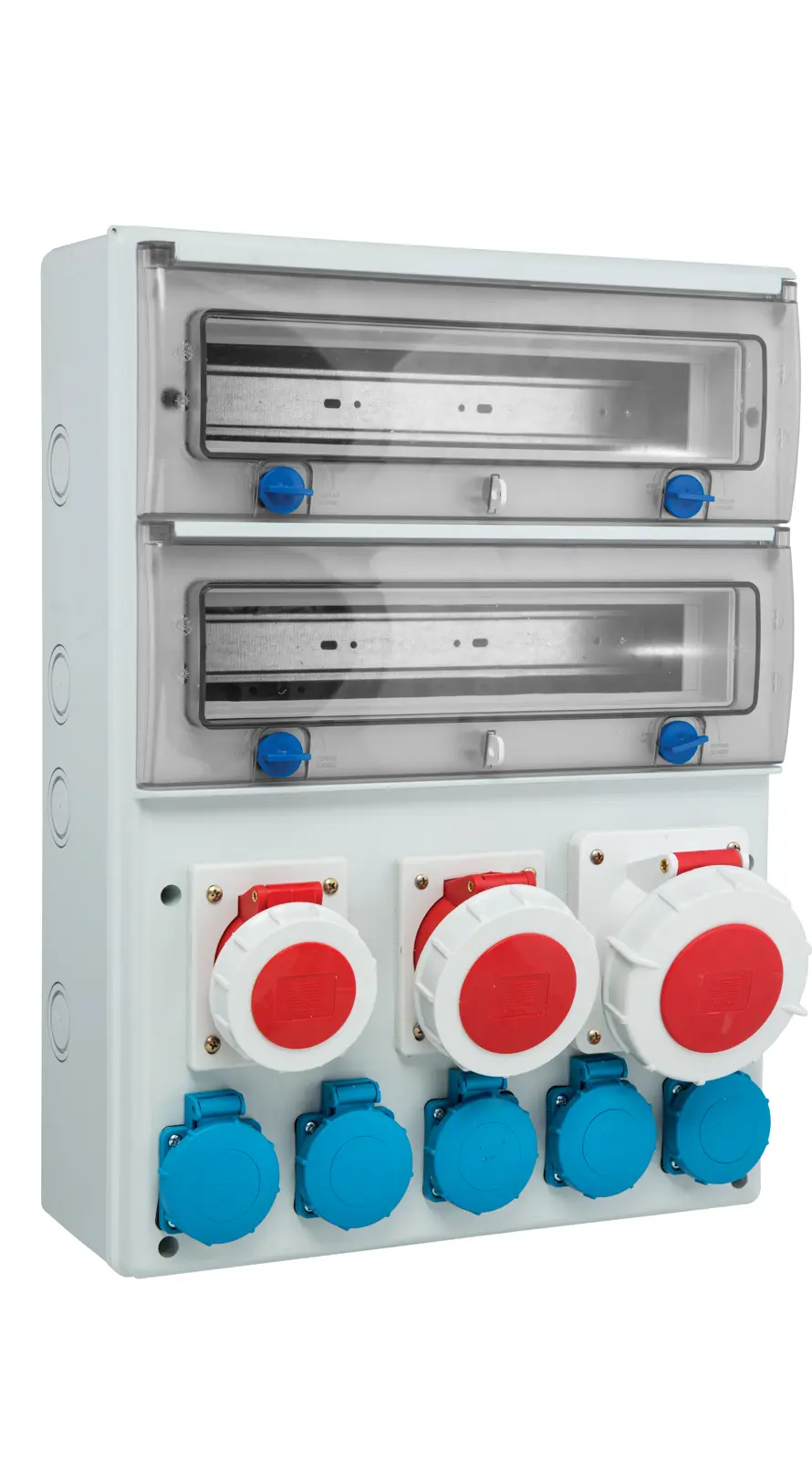 Zásuvková skriňa, PG21, IP65 Zásuvky: 5x250V/16A 1x63A/5 1x32A/5 1x16A/5 Rozmery: 500/362/223mm Lišta TH35 súčasť balenia Farba dvierok: Transparentná Farba skrine: Šedá Ochrana pred...