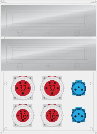 Zásuvková skriňa, PG21, IP65 Zásuvky: 2x250V/16A 2x32A/5 2x16A/5 Rozmery: 500/362/223mm Lišta TH35 súčasť balenia Farba dvierok: Transparentná Farba skrine: Šedá Ochrana pred mechanickými nárazmi: IK08 Tepelná odolnosť:...