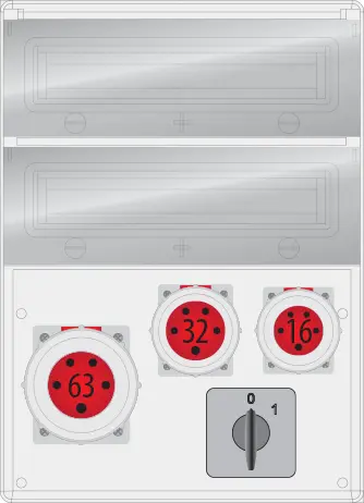 Zásuvková skriňa, PG21, IP44 Zásuvky: 1x63A/5 1x32A/5 1x16A/5 Vypínač Rozmery: 500/362/223mm Lišta TH35 súčasť balenia Farba dvierok: Transparentná Farba skrine: Šedá Ochrana pred...