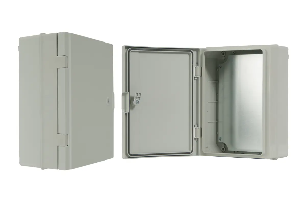 Typ: s plnými dvierkami Krytie: IP65 Rozmer: 265/355/152/315/227mm Material skrinky: P-BOX: ABS, polyuretánové tesnenie Vlastnosti: Mechanická odolnosť IK10 Použitie: -25C do +60C Farba: RAL 7035