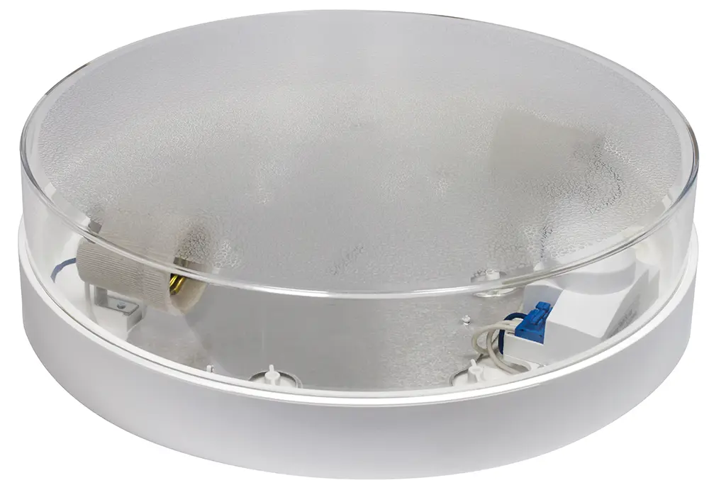 Svietidlo AFRODYTA, IP44, IK10, 2xE27 (25W), UV Snímač pohybu: radarový (chodbová funkcia) Rozmery: priemer 303 mm, výška:78,5 mm Farba prstenca: biela Farba krytu: transparentná Napájanie: 230VAC, 50Hz Balenie: 1 ks