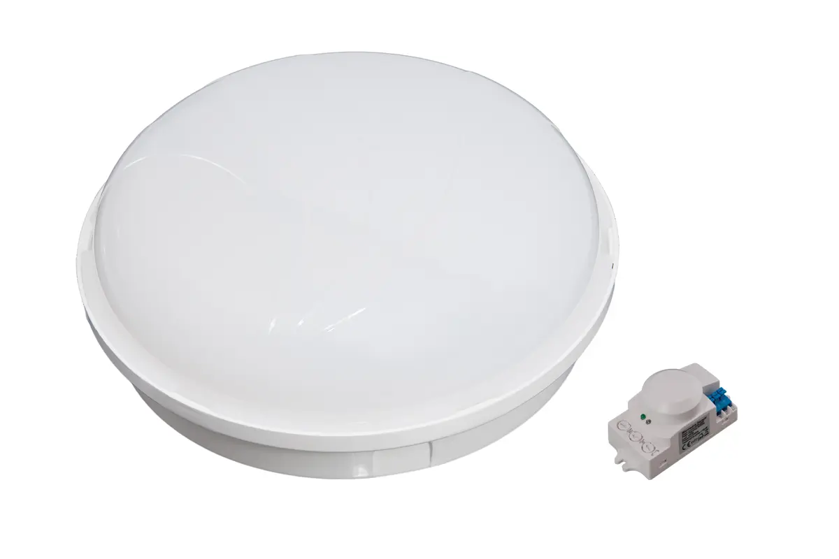 Svietidlo Panda okrúhla, IP65, IK10, LED SMD, UV, PG9 Snímač pohybu: áno, radarový Rozmery: priemer 280mm, výška:106 mm Farba svetla: neutrálna, 4000K Farba prstenca: biela Farba krytu: matná Svietivosť: 13W, 1400lm Napájanie: 230VAC, 50Hz Index podania farieb: CRI>80 Balenie: 1 ks
