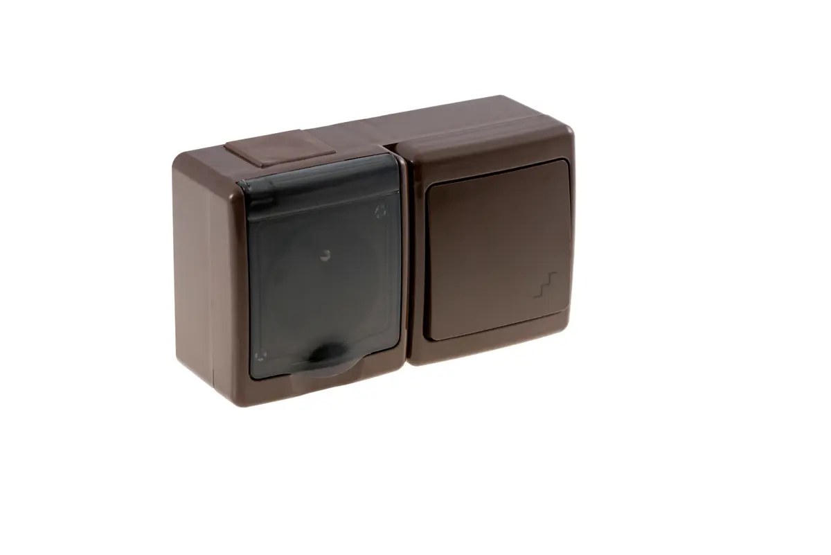 Vypínače IP44 BETA, 250V, Typ: dvojnásobný schodištoví Zásuvky 2P+Z: 1 Farba krytky: kourová Rozmery: 75/48/130 Balenie: 6ks