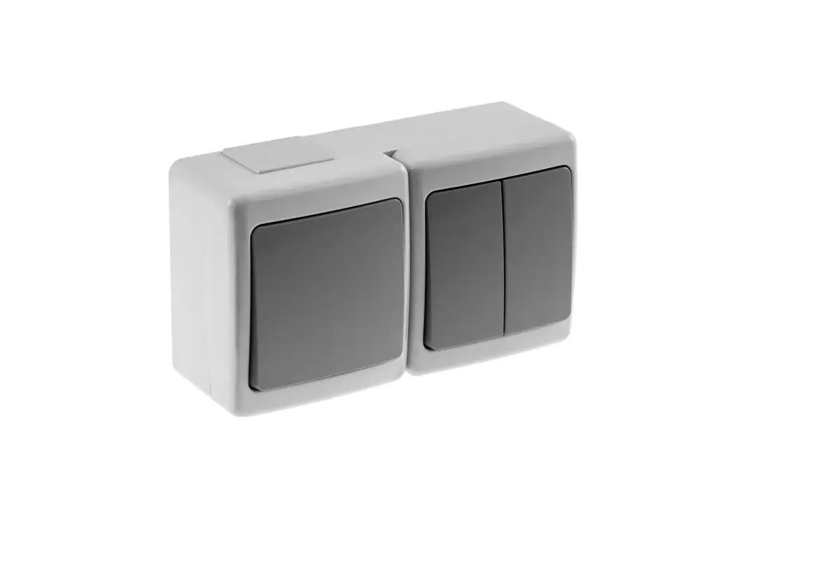 Vypínače IP44 BETA, 250V, Typ: dvojnásobný jednopolový+lustrový Farba krytky: kourová Rozmery: 75/48/130 Balenie: 6ks