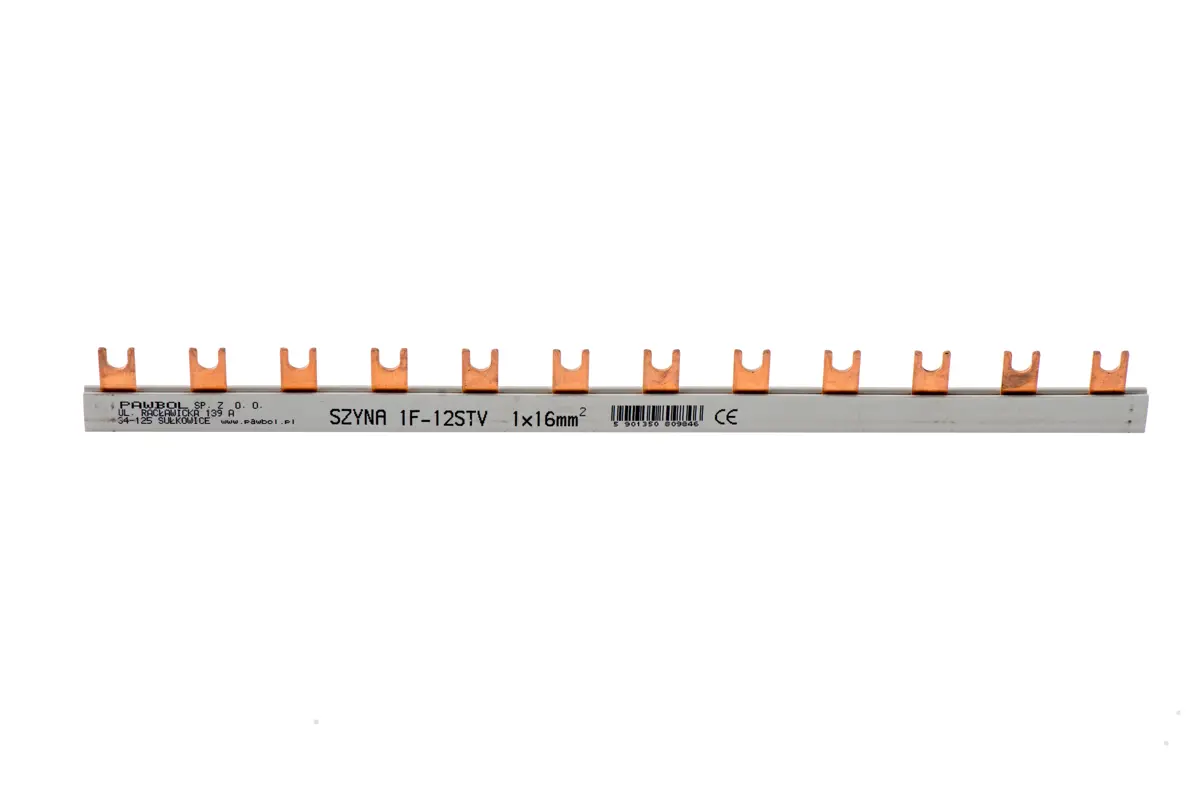 Prúdová lišta prevedenie "vidlička" Prierez: 16 mm2 Počet modulov: 12 Počet fáz: 1 Dlžka: 210 mm Hmotnosť: 90g
