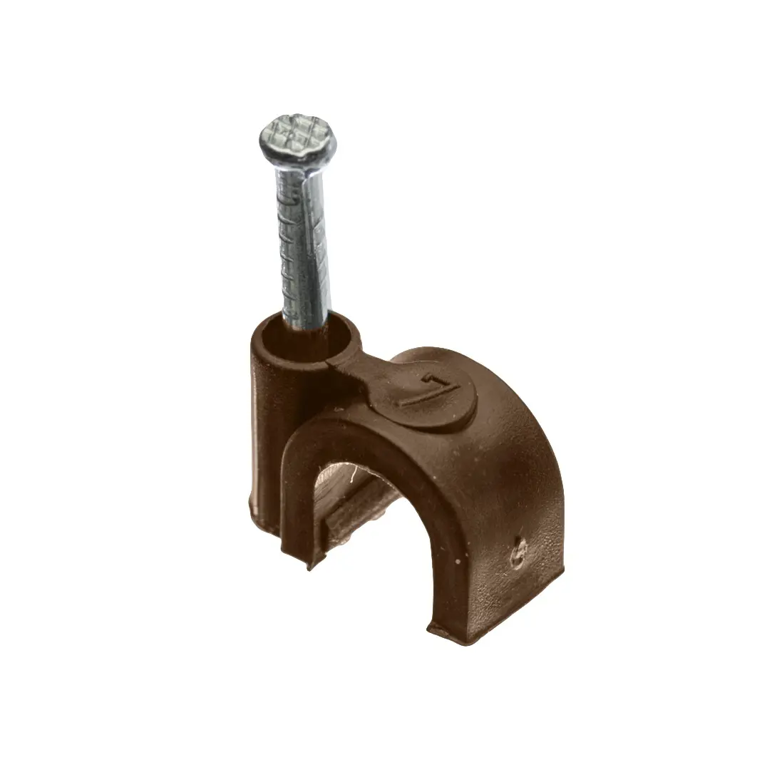 Typ: guľatá príchytka Farba: Hnedá Balenie: 25 ks (cena je za jedno balenie) Priemer kábla: 7mm Veľkosť klinčeka/priemer klinčeka: 20mm/2mm Príchytka nie je UV odolná