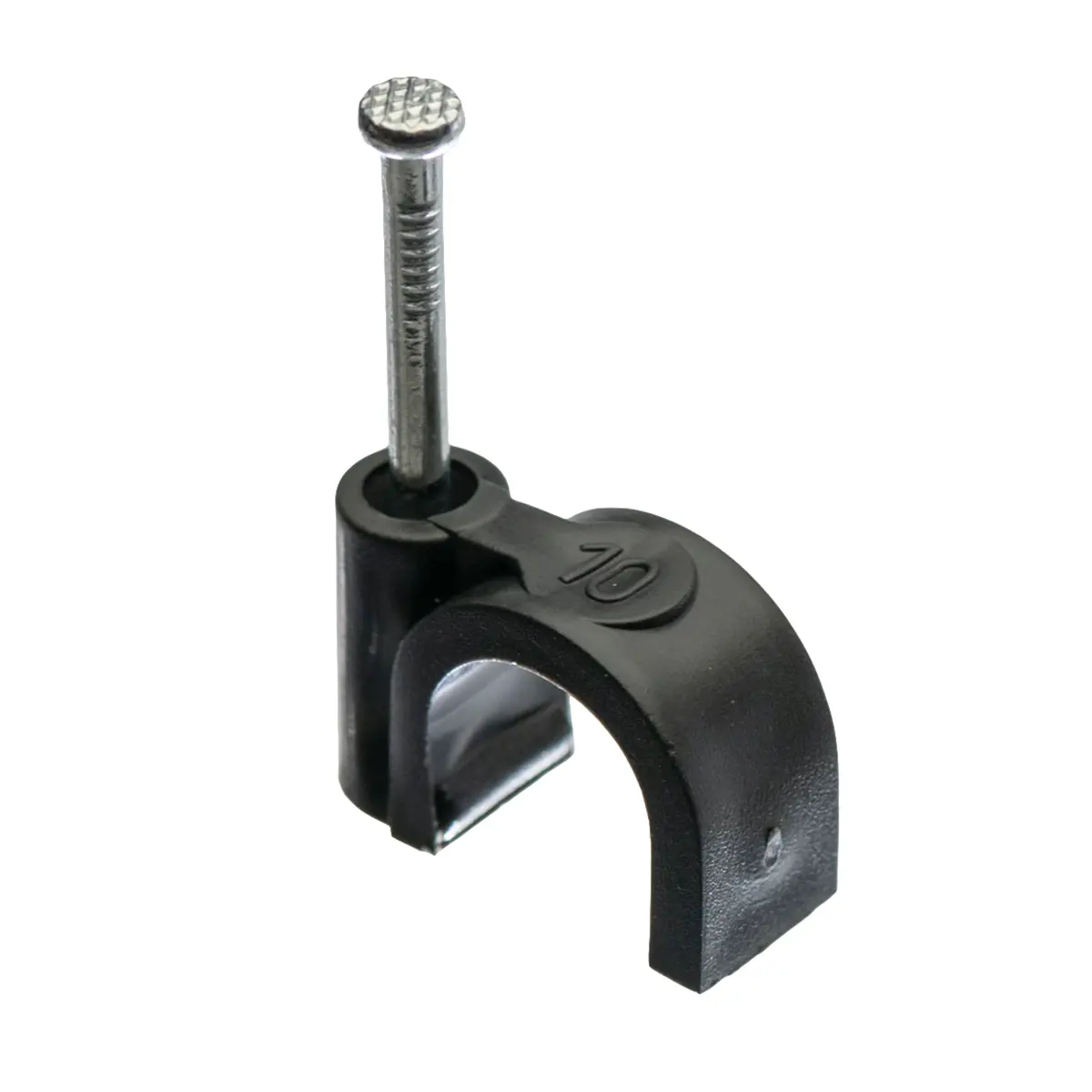 Káblová príchytka s klincom Typ: Okrúhly Farba: Čierna Priemer kábla: 10mm Veľkosť klinčeka/priemer klinčeka: 25mm/2mm Balenie: 100ks Príchytka nie je UV odolná